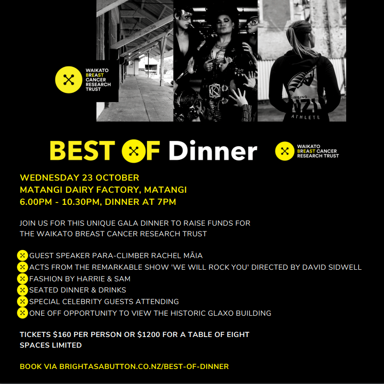Support research for better outcomes for Waikato women diagnosed with breast cancer. Tickets are still available for our Waikato Breast Cancer Research Trust’s Fundraising “Best Of” dinner to be held Wednesday 23rd October at the Glaxo Building (Matangi Dairy Factory). We are making the Factory building look glamorous for a night!