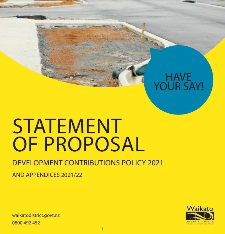Draft Development Contributions Policy 2021 – Council can charge a contribution on new developments to assist in meeting costs of infrastructure required to support such development. The explanation of the need for change and the proposed changes can be read here. https://s3.ap-southeast-2.amazonaws.com/hdp.au.prod.app.waik-shape.files/1116/1778/7968/Statement_of_Proposal_-_DCs_2021.pdf Further information and feedback forms are here: https://shape.waikatodistrict.govt.nz/draft-development-contributions-policy-2021