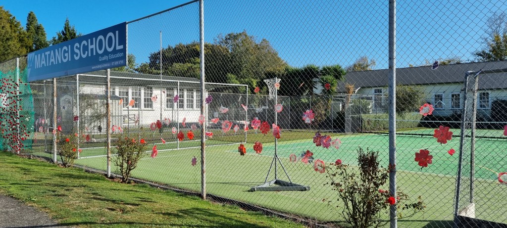 Good to see the Matangi School students handiwork and the community poppy net up to remind us of the challenges faced by families in our area when war called young people to serve. Nice to see the Matangi rose blooms joining in the commemoration.