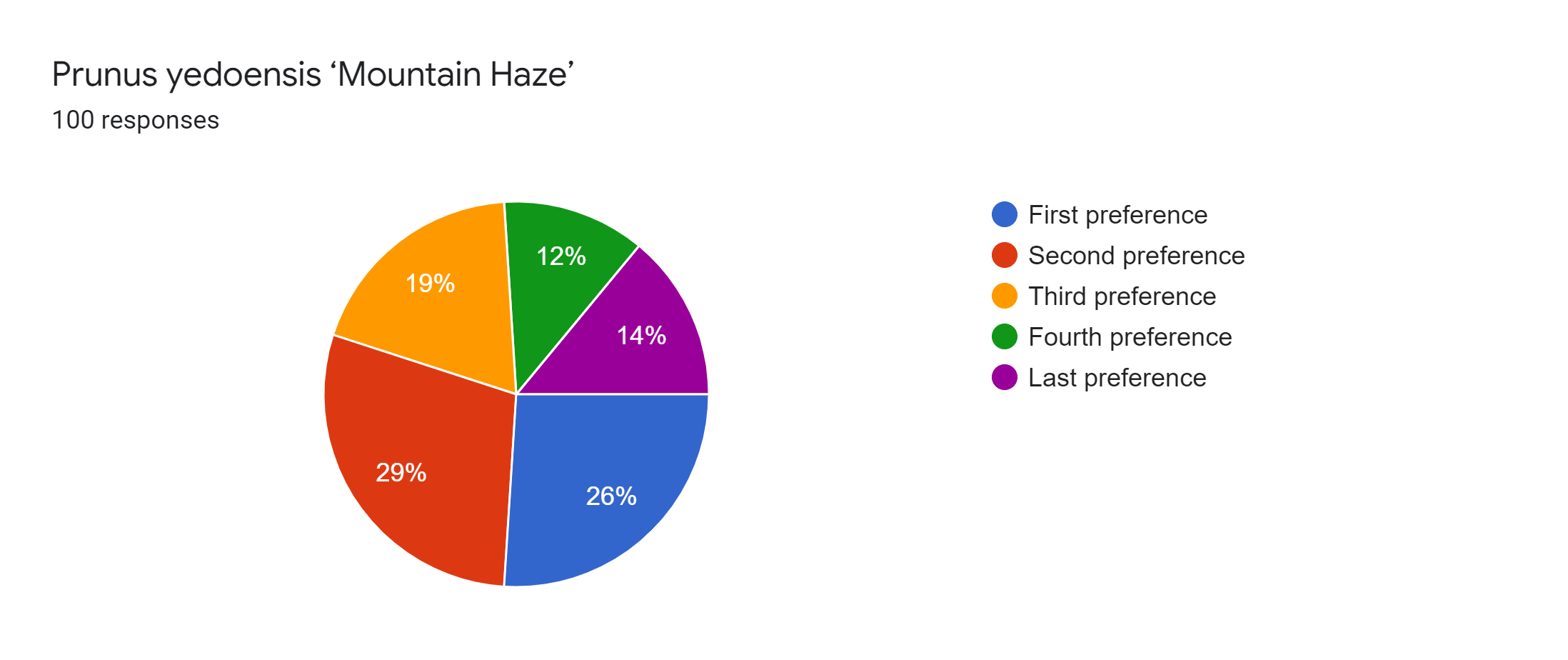The Matangi Community Committee Survey on trees for the village section of Matangi Road received 100 carefully considered responses to produce a clear choice. More than half of respondents had the Prunus yedoensis ‘Mountain Haze’ as their first or second choice.