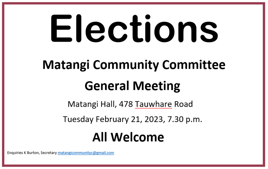 Invitation: Matangi Community Committee General Meeting, Tuesday February 21, Matangi Hall, 478 Tauwhare Road, 7.30 p.m. Election of officers and Committee. All Welcome Enquiries K Burton, Secretary matangicommunityc@gmail.com Share this: Share on X (Opens in new window) X Share on Facebook (Opens in new window) Facebook Like Loading...
