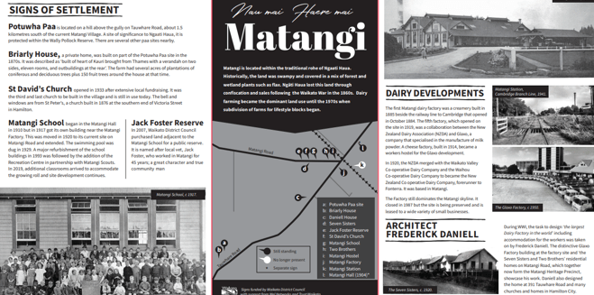 Increasingly, there are also information signs around our community with another due in the coming months. The latest sign is that placed on the wall of the Matangi Hall with a sign providing information on the rest of the village and area to be erected outside the Jack Foster Reserve once the carparking area is done.