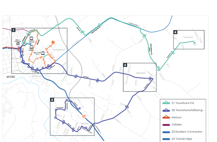 This bus service will do alternates routes between the 28: University – Tamahere/Matangi – University and 27: University – Tauwhare Pā – University You can reach any part of both routes e.g. go from Tamahere to Tauwhare Pā via the University and vice versa.
