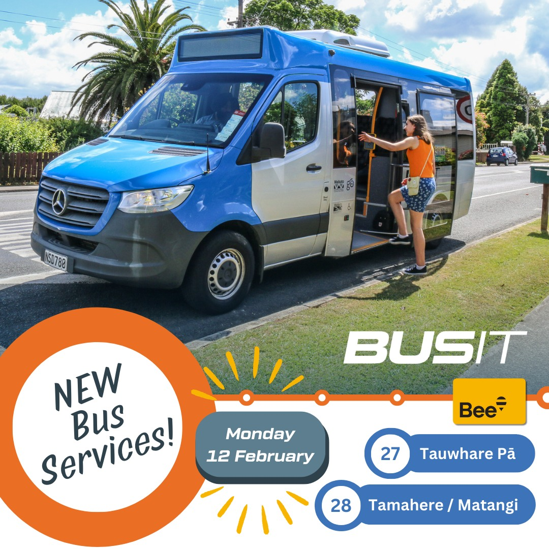 From Monday (12th February 2024) a new bus service will be launched. The 28. Tamahere/Matangi and 27: University – Tauwhare Pā – University service will connect you with your local community and the University of Waikato, from where you could connect to any Hamilton service. Read more about the service and find out more information about the the timeable and route here.