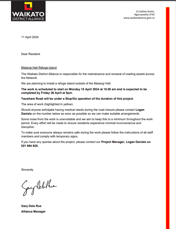 To ensure pedestrians can safely access the Matangi Hall a crossing point and refuge island are to be constructed on Tauwhare Road near the Hall. If you have any concerns please make contact with the contractors as per the letter to residents: