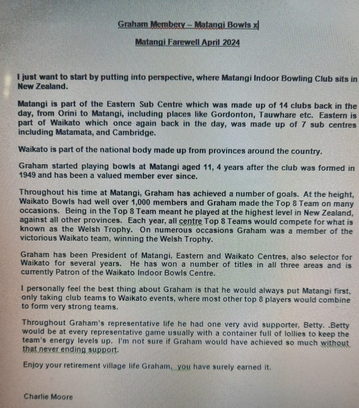 Charlie spoke of Graham’s long, highly successful and dedicated career in Indoor Bowls in the Matangi, Hamilton, Waikato and National arenas. He wasn’t the only person on the day who noted that Graham always put Matangi first in his considerations. The full script of the speech is here