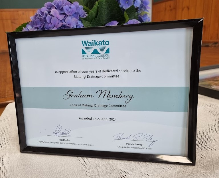 Councillor Beavis spoke of Graham’s background in Matangi and activities for local organisations including being the inaugural Chair of the Matangi Community Committee. She has shared the event in an article in the Cambridge News https://www.cambridgenews.nz/2024/05/saluting-our-stalwarts/