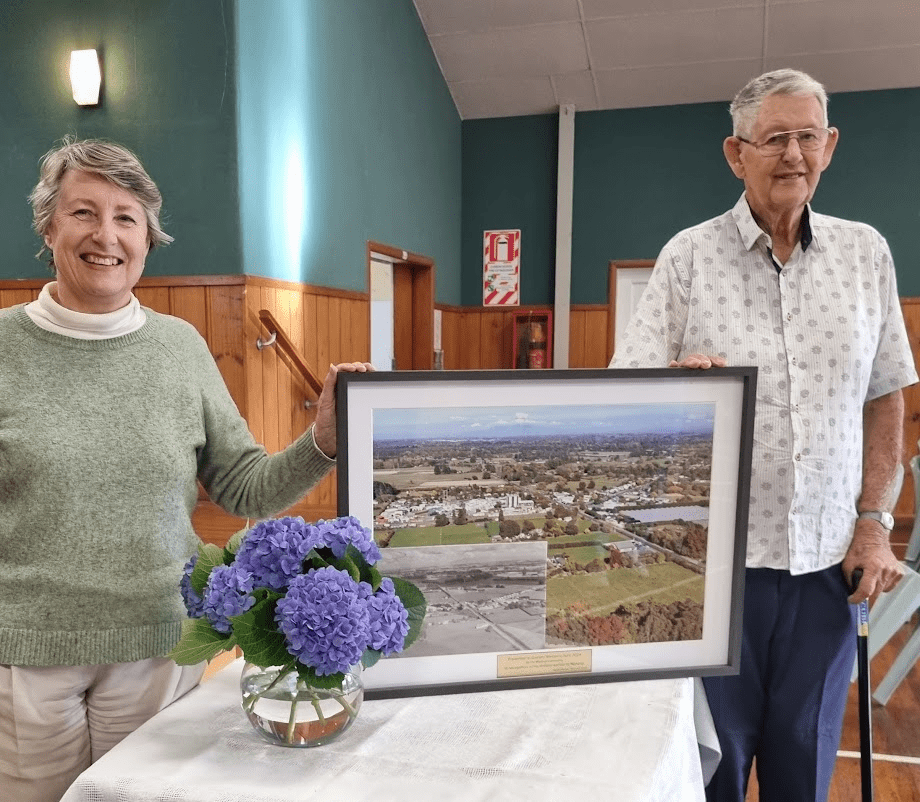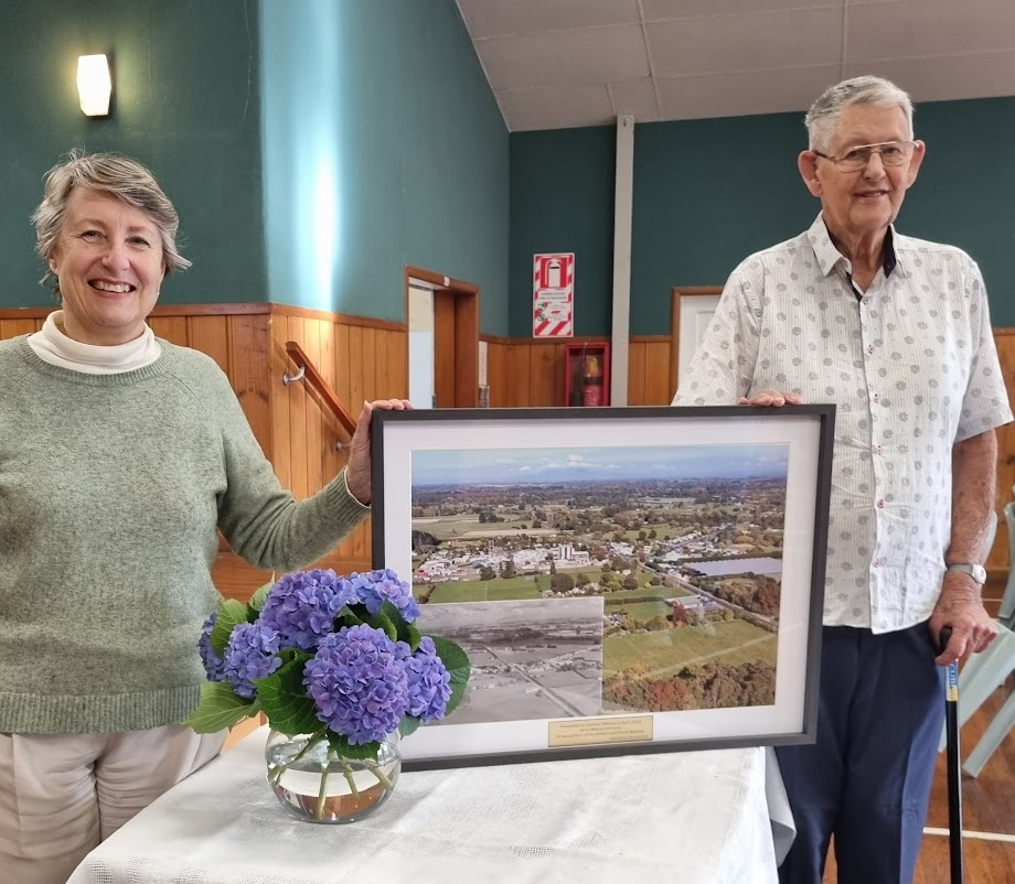 In acknowledgement of his contribution Graham was presented with a picture that included the wording “Presented to Graham Membery April 2024. In recognition of his tireless service to Matangi. By the Matangi Community. Aerial photos 1951 and 2024” Grateful thanks go to Andrew Mowbray for bringing this idea to fruition.