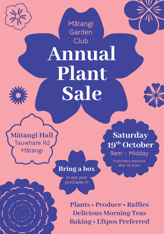 The Matangi Garden Club Annual Plant sale at the Matangi Hall is always a popular day in the local garden year. The range of plants for sale includes indoor plants, vegetable and flower annual seedlings and plants, perennials, shrubs and trees. The produce stall includes baking, preserves, fresh vegetables and raffles on sale.