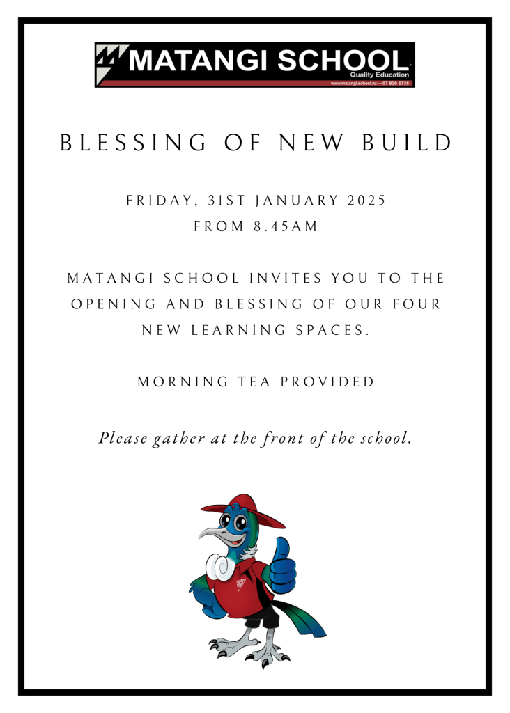 Invite to Matangi School for the Blessing of the New Build. Friday, 31 January, 2025. All Welcome. Share this: Click to share on X (Opens in new window) X Click to share on Facebook (Opens in new window) Facebook Like Loading...