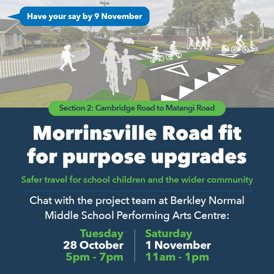 We want to hear your thoughts on proposed improvements to Morrinsville Road. We’re looking to make it safer and easier for people walking, scootering, and biking – especially school children and the local community. The improvements are 100% funded by NZTA Waka Kotahi. Come and chat with the project team at our drop-in sessions: