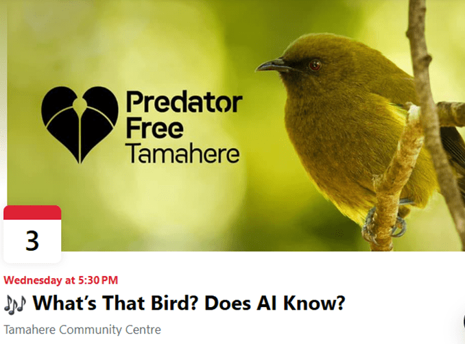 Come to hear Waikato University senior researcher Len Trigg talk about using artificial intelligence to help us identify the birds we hear at the Tamahere Community Hall at 5.30pm on Wednesday 3 December. To make the most of the session you’re advised to download the free Merlin Bird ID and BirdNET apps and try recording some birdsong around your home. This fascinating free session is being hosted by Predator Free Tamahere – who ask that you RSVP on their Facebook page to help them plan for light refreshments on the night.